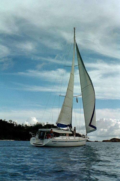 Als Segelschiff, sofern man Wind hat, bleibt sie aber ein Kompromiss. Sie reagiert sehr träge auf Steuerung, Manöver brauchen Übung und Gewöhnung. Die Geschwindigkeit beträgt schlappe 5,5 Knoten (bei 2200 U/min.). Das Log zeigt jedoch max. 4 kn. an. Der Treibstoffverbrauch, ca. 5 lt. pro Stunde, ist entsprechend hoch. 1 lt. Diesel kostet 1 $ (5 SR)